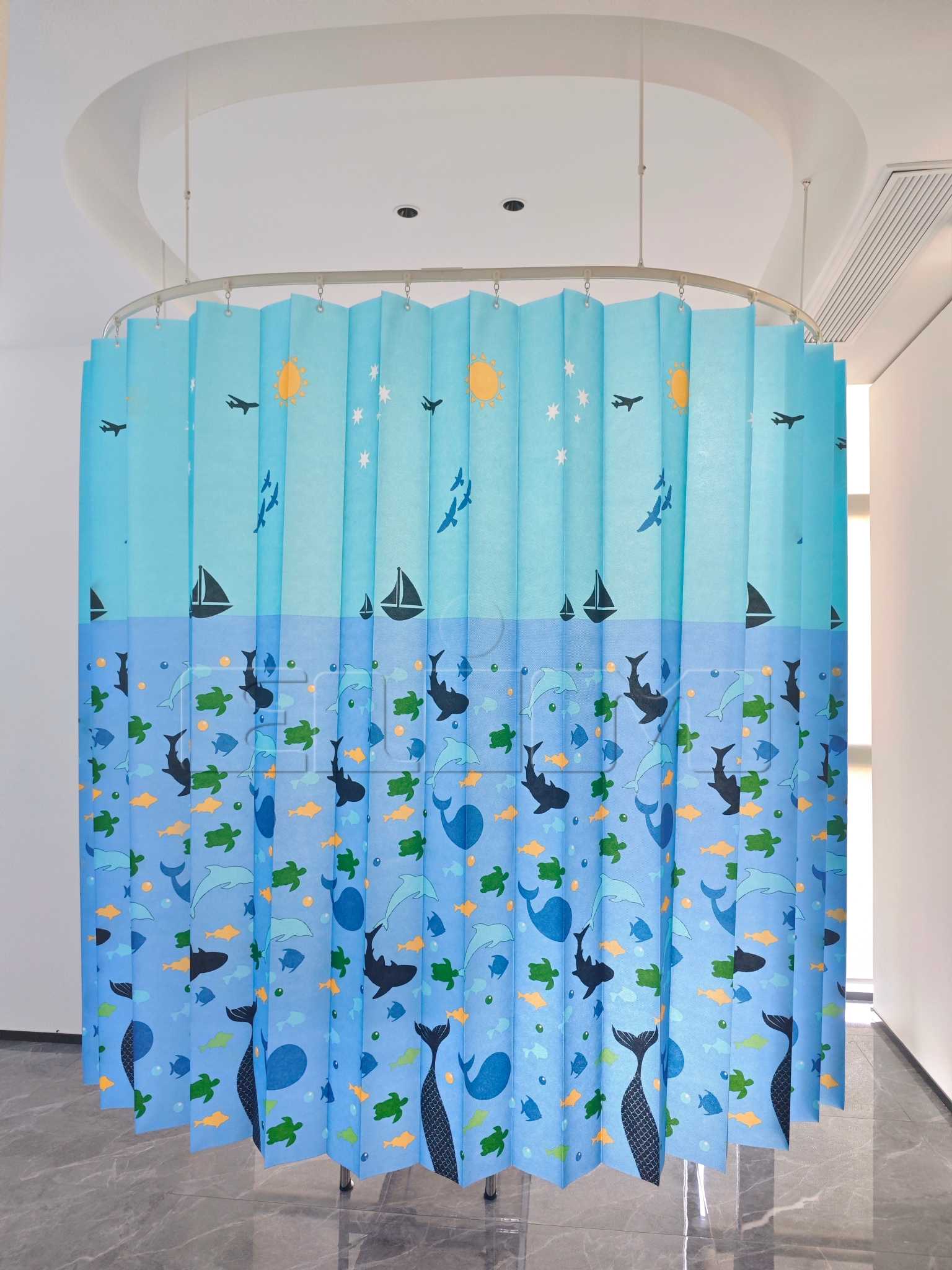 Toisin kuin tavalliset sairaalaverhot, Pediatric Antimikrobial Hospital Curtain priorisoi lasten erityistarpeet. Kankaassa on eloisia, ikään sopivia kuvioita, kuten sarjakuvahahmoja, eläimiä tai luontokohtauksia, jotka luovat rauhoittavan ilmapiirin nuorille potilaille. Tämä suunnittelutapa on validoitu kumppanuuksien kautta johtavien lastensairaaloiden kanssa, joissa palaute on korostanut ahdistuksen vähenemistä ja parempaa yhteistyötä lääketieteellisten toimenpiteiden aikana. Lisäksi verhot ovat paloa hidastavia ja täyttävät kansainväliset turvallisuusstandardit, kuten NFPA 701 ja EN 13501-1, mikä takaa tiukkojen terveydenhuoltomääräysten noudattamisen. Kevyt mutta kestävä polyesterisekoitus kestää repeytymistä ja haalistumista jopa toistuvan pesun jälkeen, joten lasten antimikrobinen sairaalaverho on kustannustehokas ratkaisu vilkkaasti liikennöidyille alueille.